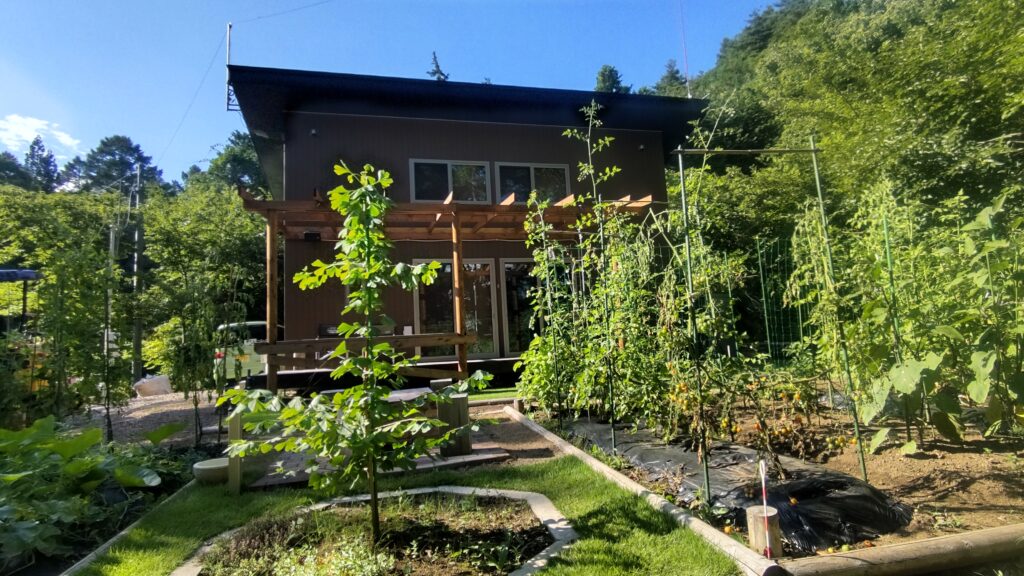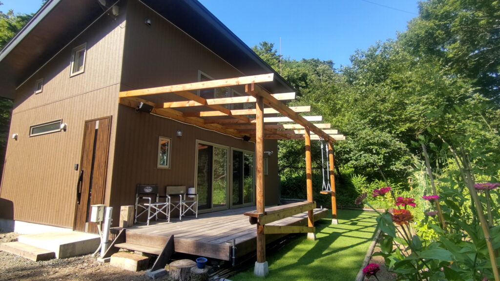 別荘というほどのものではありません。小さな家庭菜園とひなたぼっこができるウッドデッキと雨風しのげて休憩できるところがあれば良いだけでしたが、成り行きでちょっと大げさになっただけです。